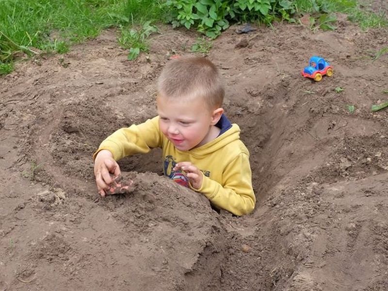 Ben speelt in de tweede afgraving van Vicky. De eerste heeft Mariska dichtgegooid, nadat ze met een duimstok had vastgesteld dat het hol meer dan een meter (!) onder het gazon gegraven was.