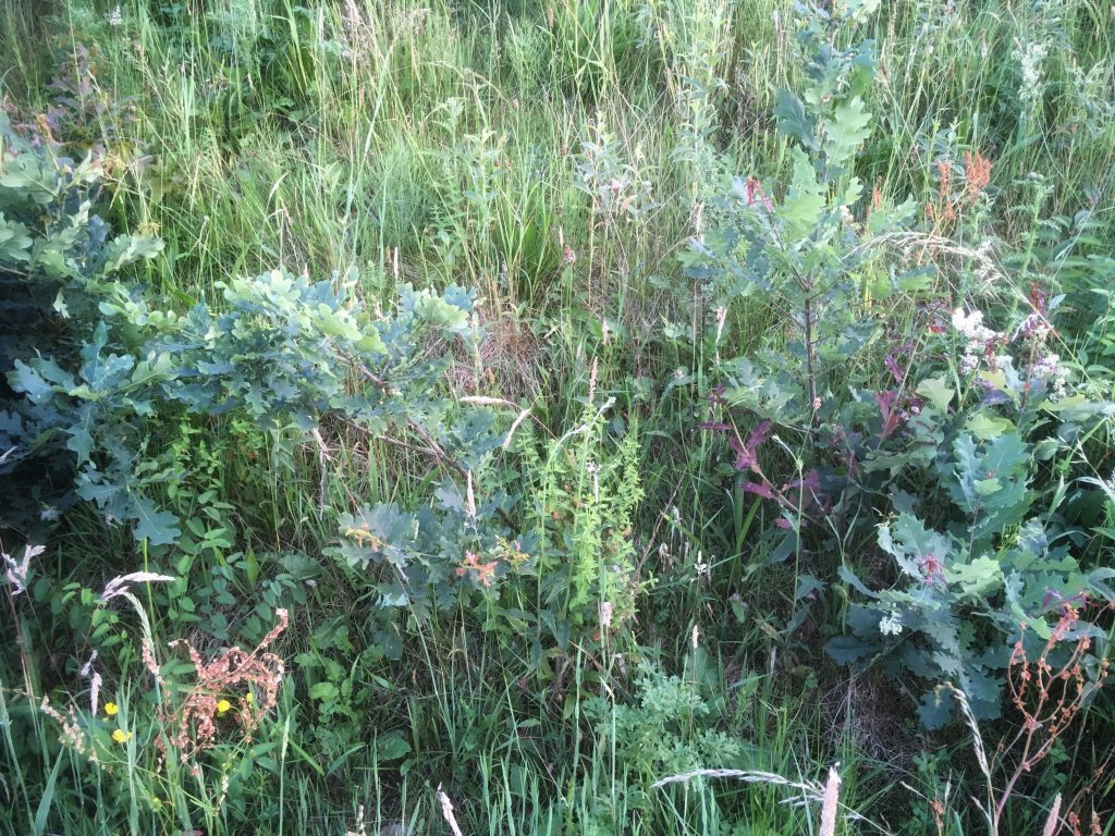 Bij afslag Meppel-Noord groeien onderaan de rotonde piepjonge eikjes. Dat komt, denk ik, omdat er daar nogal eens een eikel van de weg af raakt.