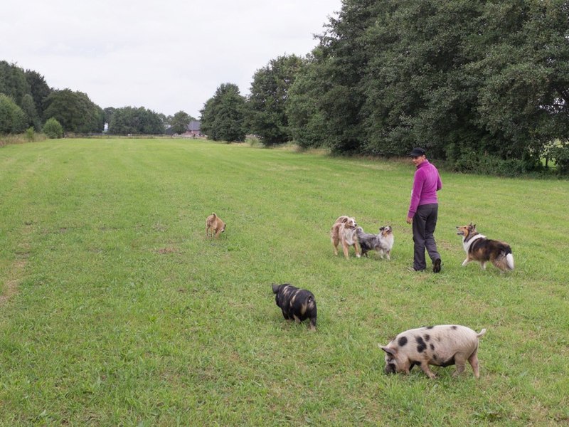 Een groot deel van de dag hebben we ons best gedaan voor een varkenswei. Wijs geworden door de ervaringen van de afgelopen weken ook direct maar stroom op de draden. We waren heel tevreden over het resultaat. Maar toen Mariska eind van de middag met de honden ging wandelen wilden ze toch heel graag mee!