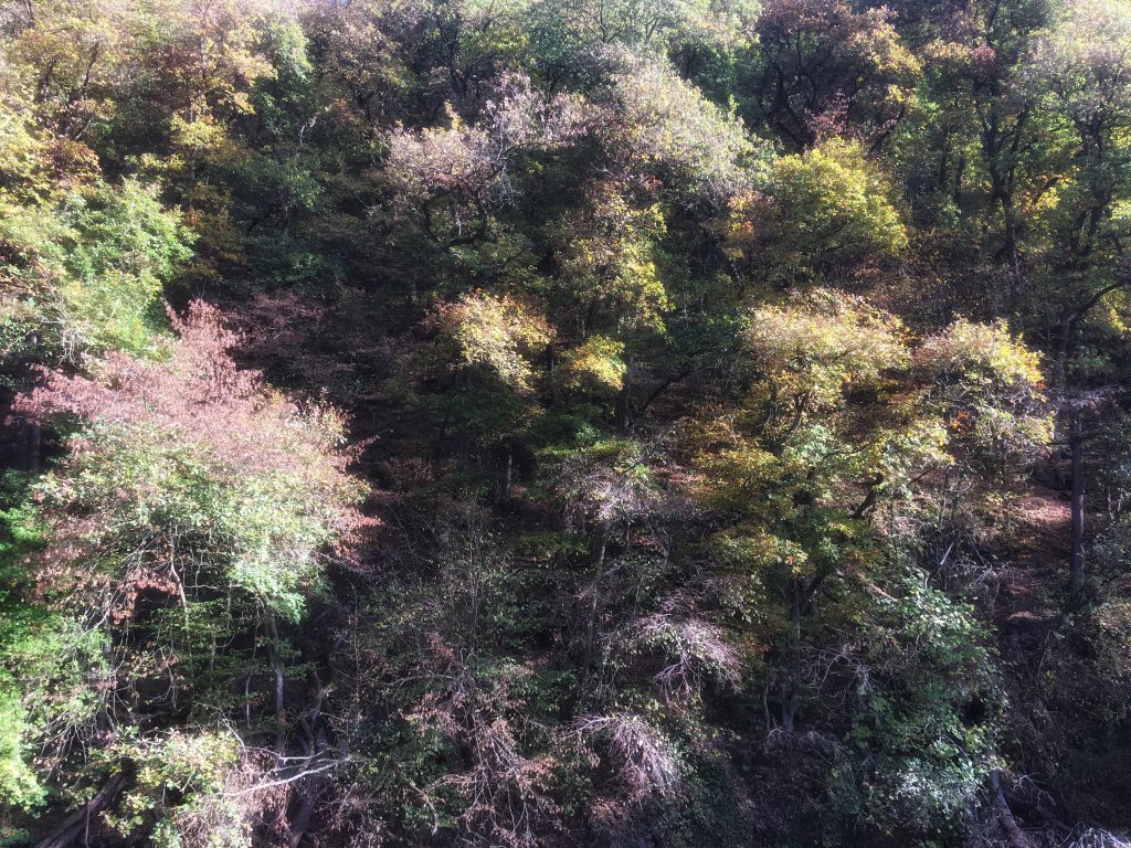 Aan de overkant van de rivier staan beuken, eiken, platanen, walnoten, kastanjes, berken en nog veel meer.