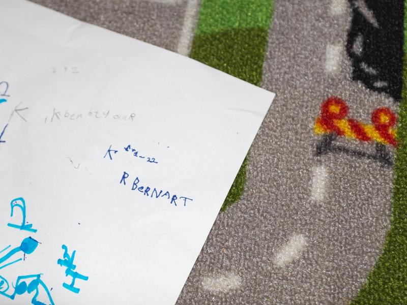 's Avonds op weg naar mijn bed viel mijn oog op een papier op het speelkleed boven. Ik bekeek het in het voorbijgaan, maar mijn oog bleef wat plakken bij de letters. Een ondeelbaar ogenblik was nodig om te doorgronden wat hier gebeurd was: de 'R'is begrepen, geoefend en toegevoegd aan het repertoire.