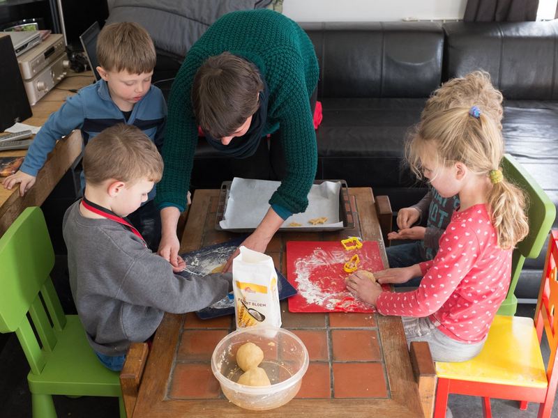 ... ..... .. ... ..... ...... *plop* Neem me niet kwalijk, ik had mijn oordoppen nog in. Nog even, en dan komen Ronald en Susan hun kroost ruilen voor een bak Chinees. De dame en heren hebben zich vermaakt, vandaag! Op de foto bakt het gebroed koekjes. Mijn geduld staat gebogen over de tafel.