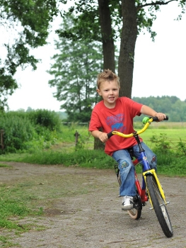 Iets leuks nu: Han fietst zonder zijwieltjes! Eergisteren voor het eerst. Deze foto is van gisteren. Al meer dan een jaar verkondigde Han dat hij pas zonder zijwieltjes ging fietsen wanneer hij vijf was, en niet eerder. Maar afgelopen woensdag ging een zijwieltje stuk. Hij wilde fietsen en moest dus zonder, want... papa was niet thuis. Al vanaf de eerste minuut knalde hij met hoge snelheid over het erf, door het gras, over plankjes en stenen, etc. In niets leek het op een mannetje dat voor het eerst zonder zijwieltjes fietst. Stoer!