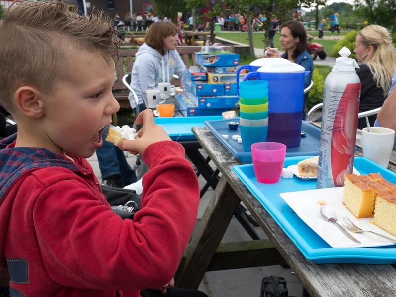 Han is zes! Deze foto vertelt het grootste deel van het verhaal van vandaag: koffie, appeltaart, limonade, cake, slagroom en heerlijk weer. En kilo's verse Lego®;laten we dat vooral niet vergeten.