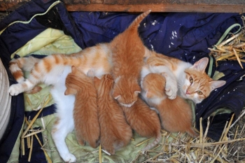 Het is een beetje een ISO 6400-fotootje genomen vanuit een saai standpunt, maar het geeft in ieder geval een beeld van hoe het gaat met moederpoes en haar kroost. Er was nogal wat vraag naar. Het gaat goed met ze. Ondanks vijf kittens die haar leegzuigen komt ook moederpoes goed op gewicht. Bepalen wat mannetjes en vrouwtjes leek ons lastig, maar bleek heel eenvoudig: we namen de kittens apart van elkaar, en deden wat melk op onze vingers. Als hij het aflikte was het een kater, en als zij het aflikte was het een kattin. Deze methode werkt trouwens bij heel veel diersoorten. De stand is 4-1 voor de dames.