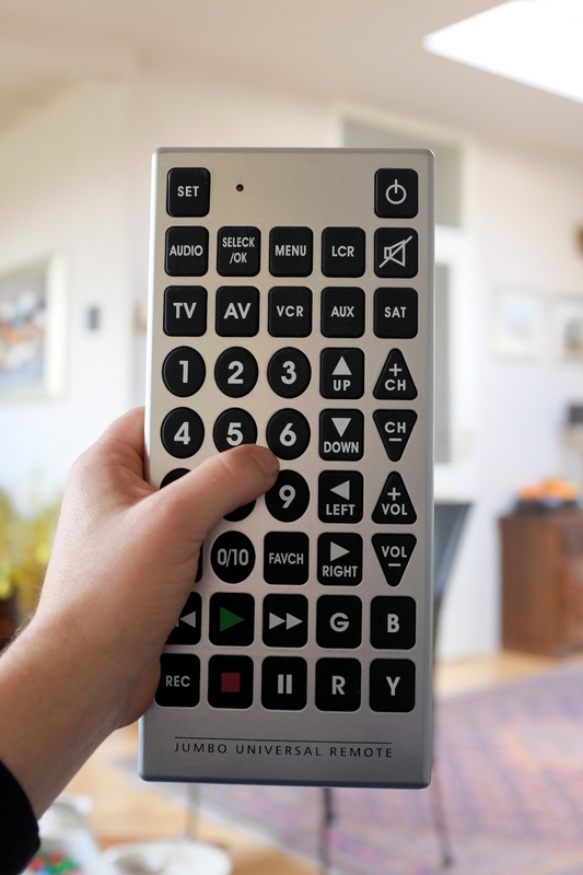 Paaslunch bij mijn oom Hans en tante Lieke. Het was met net zoveel gezelligheid als eten. Op een gegeven moment zat ik wat uit te buiken op de bank, en vroeg mij af of wat ik zag een lade was. Het was een lade. In de lade lag een afstandsbediening. Het is niet dat ik voor het eerst een afstandsbediening zag, maar... het was wel voor het eerst dat ik er een zag in dit formaat.