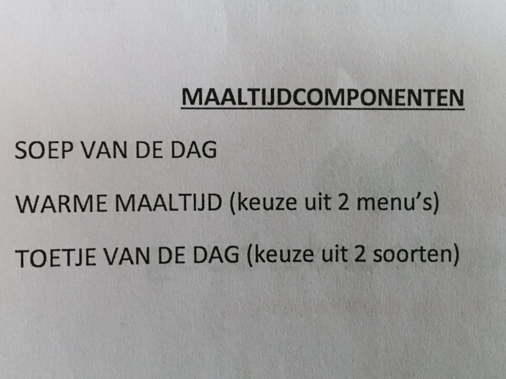 Maaltijdcomponenten. Op dezelfde menukaart heette de verandermanager ons welkom.
