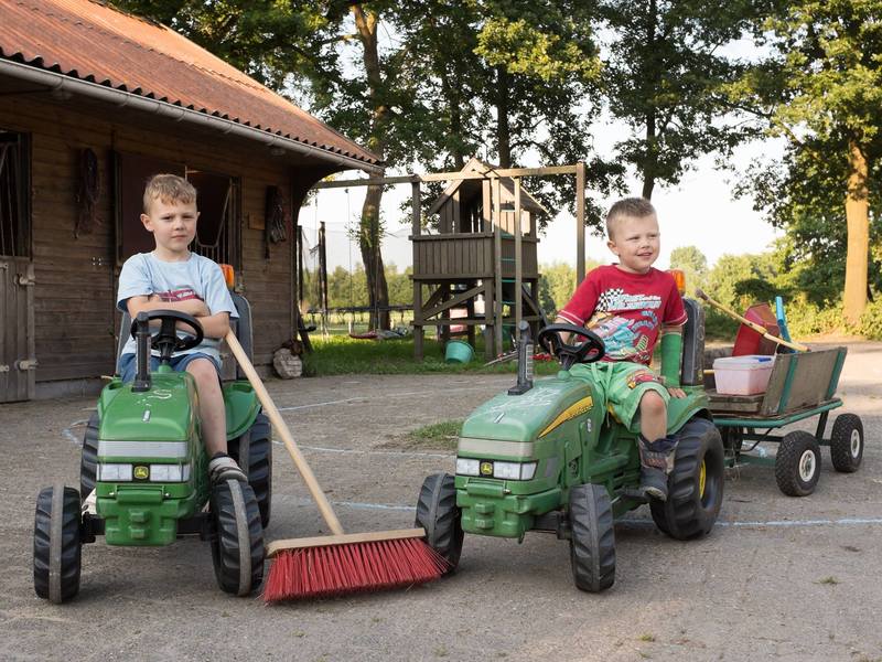 Han speelt 'veegwagen'met z'n tractor en bezem. Da's best zwaar!