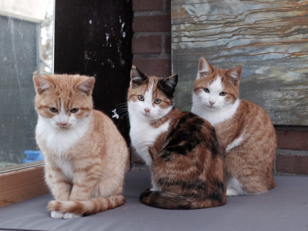 Van voor naar achter, van links naar rechts: Garfield, Vlekje, Darwin. Nu nog jong, en dus op hun liefst. Maar ik voorspel dat we ze nog regelmatig bij hun voorletters noemen..