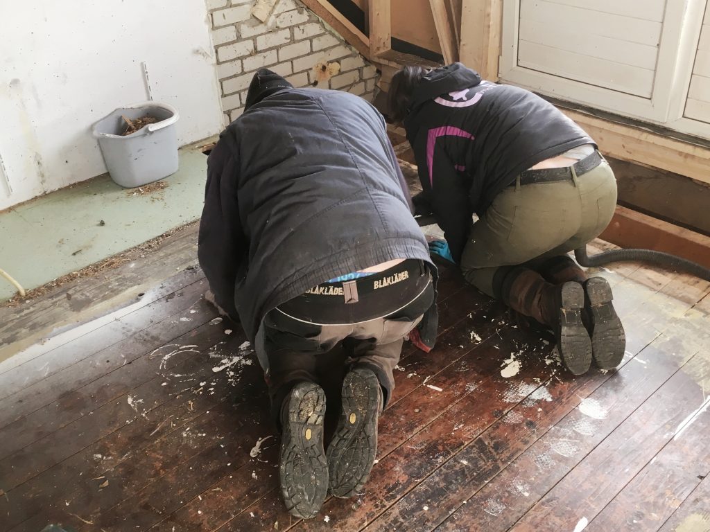 Roel en Mariska zoeken naar de spijkertjes waar het ondertapijt mee vast zat. De lekkage is verholpen, en het lage water is intussen verdampt.