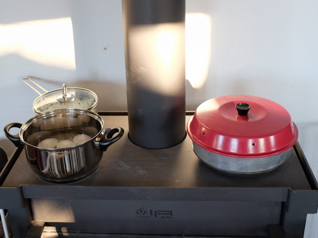 Thee, eieren en brood. 't Is druk op de kachel. Gezellig druk.