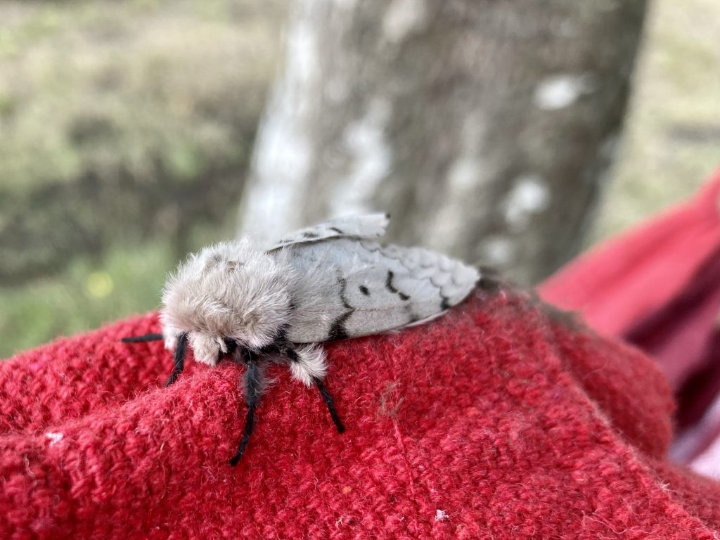 In m'n favoriete hangstoel legt een uiterst aaibare nachtvlinder eitjes. Ik heb het maar zo gelaten.